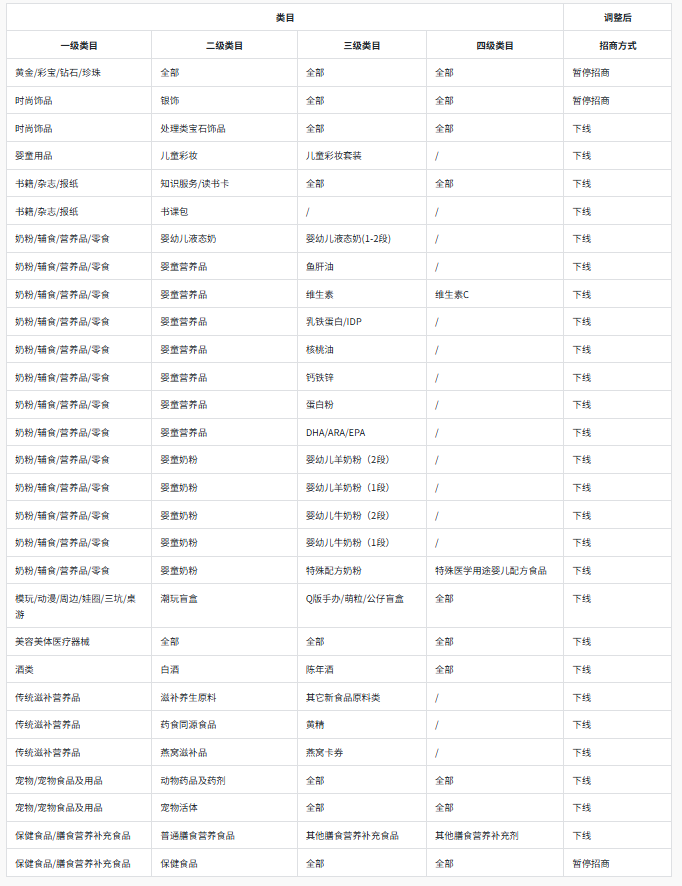 与此同时,一批高风险、社会敏感类目标识“下线”,全面禁止新品上架并清理存量商品。具体包括儿童彩妆套装、婴幼儿液态奶1-2段、部分婴童营养品,如鱼肝油、维生素C、乳铁蛋白等、美容美体医疗器械、宠物活体、白酒陈年酒、燕窝卡券等。调整范围集中覆盖婴幼儿食品、医疗器械、贵金属交易、滋补品等多个领域,形成了对高风险品类的全面管控。