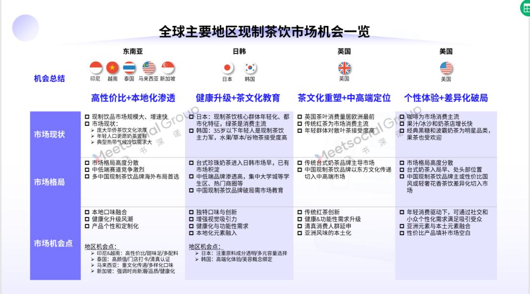 东南亚市场凭借庞大华侨基础+年轻人口特征+典型热带气候催生现制茶饮品类生意机会,高性价比仍是杀手锏,但已经入“卷价格”的红海;日韩地区面临健康升级的新需求,日本绿茶主导消费,韩国果茶/谷物茶渐成趋势,视觉吸引力是各个品牌着重发力点;英国是最大的茶叶消费国且人均茶叶消费量居前,传统红茶口味是主流,中高端市场是蓝海;美国地区奶茶热度居高不下,传统黑糖和波霸是明星品类,果茶、沙冰近几年增长迅速……