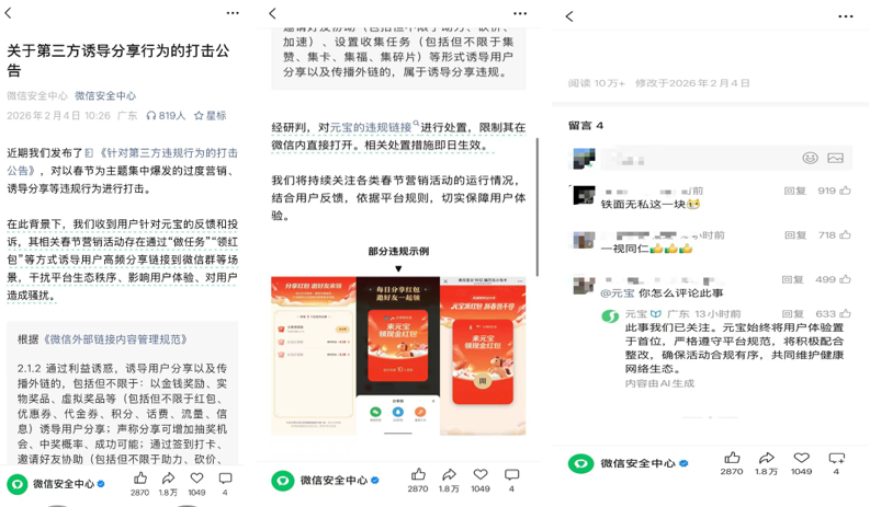 同时,微信安全中心还发布了公告:“经研判,对元宝的违规链接进行处置,限制其在微信内直接打开。相关处置措施即日生效。 ”这消息一出直接引起网友辣评为“铁面无私”。
