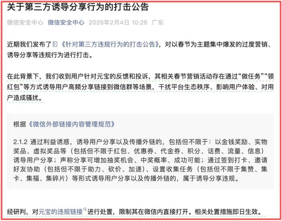 然而,随着活动热度攀升,相关问题也随之显现。2月4日,微信安全中心发布公告称,收到用户针对元宝的反馈和投诉,其相关春节营销活动存在通过“做任务”“领红包”等方式诱导用户高频分享链接到微信群等场景,干扰平台生态秩序、影响用户体验、对用户造成骚扰。
