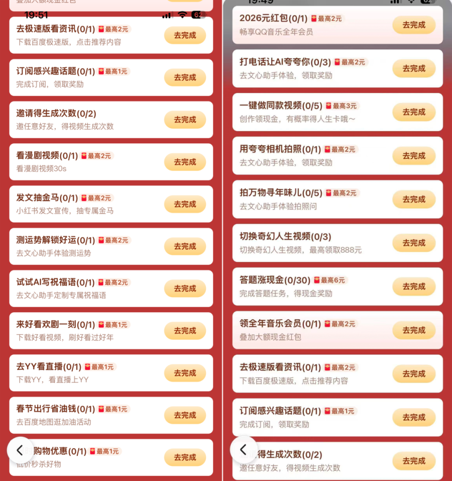 有一类任务是希望用户能够试试AI功能,比如用文心拍照提问问题,用AI做视频,这相当于用红包当“学费”,引导用户亲手体验一遍,记住这个AI能干什么。也有一类任务是为百度的生态服务,比如给度小满、YY、百度地图、贴吧等引流。