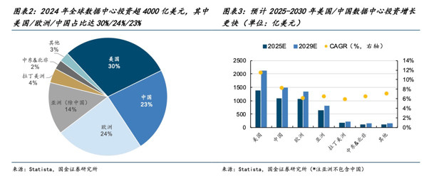 在全球数字化转型的背景下,传统数据中心市场在智能化需求推动下稳步增长。据Statista数据,预计到2029年,全球数据中心投资规模将超过6,000亿美元,其中美国和中国的投资增速尤为突出。而随着人工智能应用的深入,AIDC的增长潜力更为显著,全球新增装机量预计将从2024年的7GW增至2028年的59GW,CAGR高达73%,占全部数据中心装机比重提升至48%。