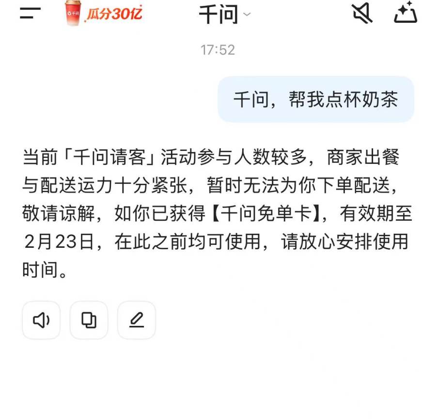 面对这些问题,千问方面表示正与合作伙伴紧急沟通,优化系统承载能力并协调配送资源。“我们理解当前出现的一些不便,感谢用户的耐心。”