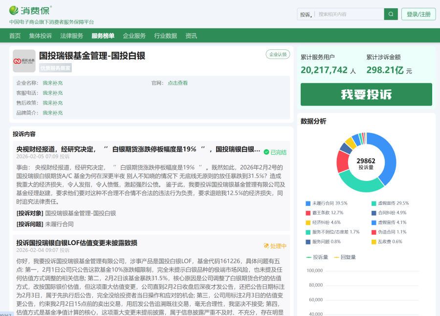 据不完全统计,仅消费保一个投诉平台,“国投白银LOF擅自追溯调整估值致损”的集体投诉量就累计超过1.76万条,参与维权的投资者超1.7万人。更有投资者专程赶赴上海国投瑞银基金总部,报警并全程直播维权过程,可见情绪之激烈。