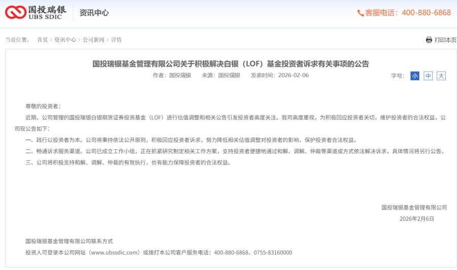 随着投诉量持续暴涨,舆情不断发酵,2月6日晚间,国投瑞银终于发布了最新回应公告。核心只有三点,一是高度重视投资者诉求,秉持依法公开原则,努力降低估值调整对投资者的影响;二是已成立工作小组,正在抓紧研究制定相关工作方案;三是支持投资者通过和解、调解、仲裁等合法渠道解决诉求,具体细节后续另行公告。