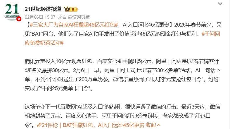 随着千问下场,这场AI助手的用户争夺战,进入了白热化阶段。当45 亿元红包砸向拉新营销,BAT 真的能复制移动互联网时代的增长奇迹吗?这场被微信 “限流” 的混战,究竟是 AI 普及的加速器,还是大厂FOMO(害怕错过)情绪下的跟风?