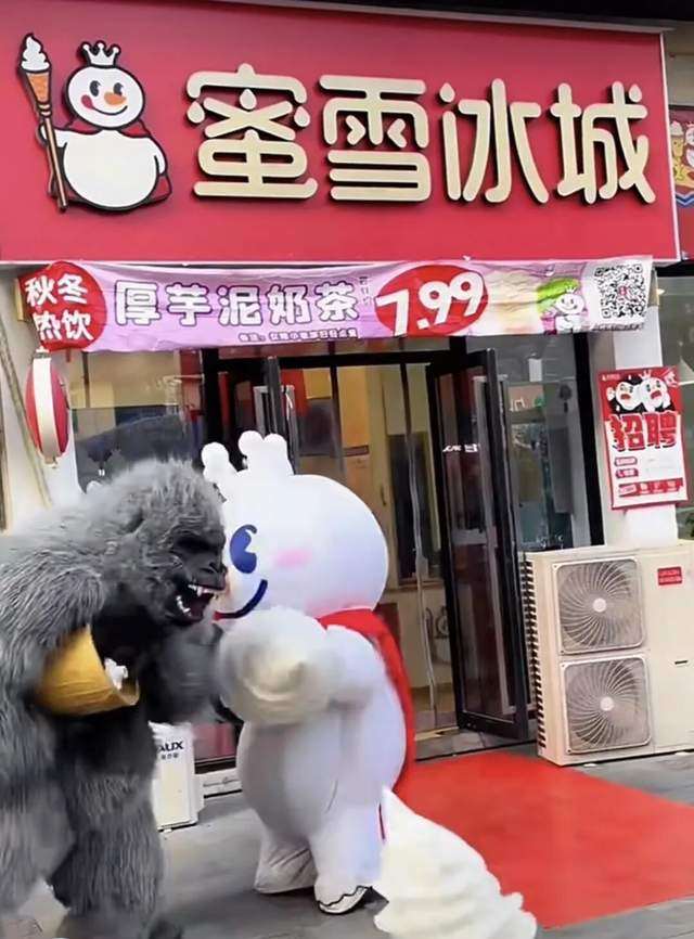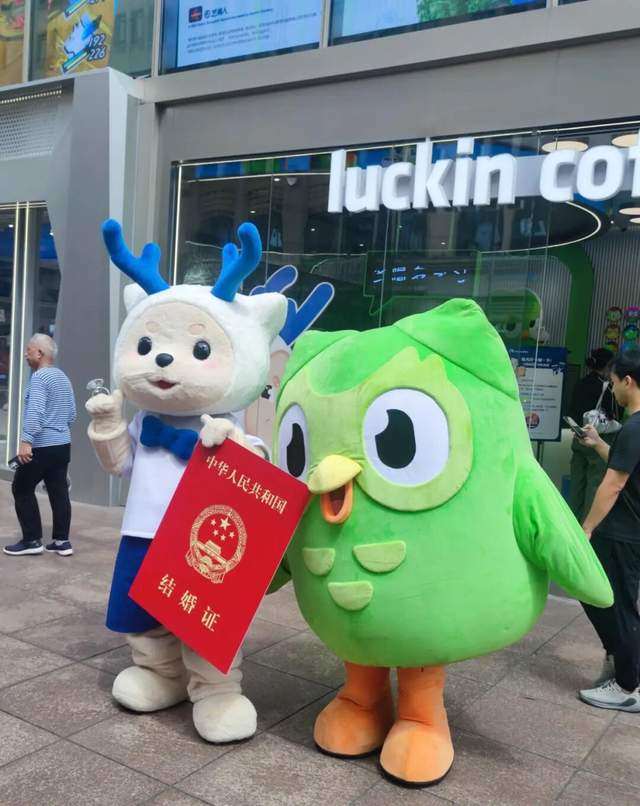 其一是通过极低成本的玩偶服进行大规模外形营销, 比如蜜雪冰城著名的“雪王街头斗殴”、“和其他品牌吉祥物商战”,以及多邻国大绿鸟和瑞幸联名结婚,这些原本笨重的玩偶服,因其行动不便产生的滑稽感,反而成为了天然的短视频素材库。