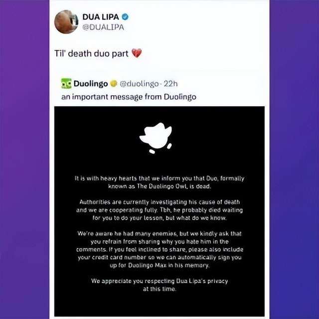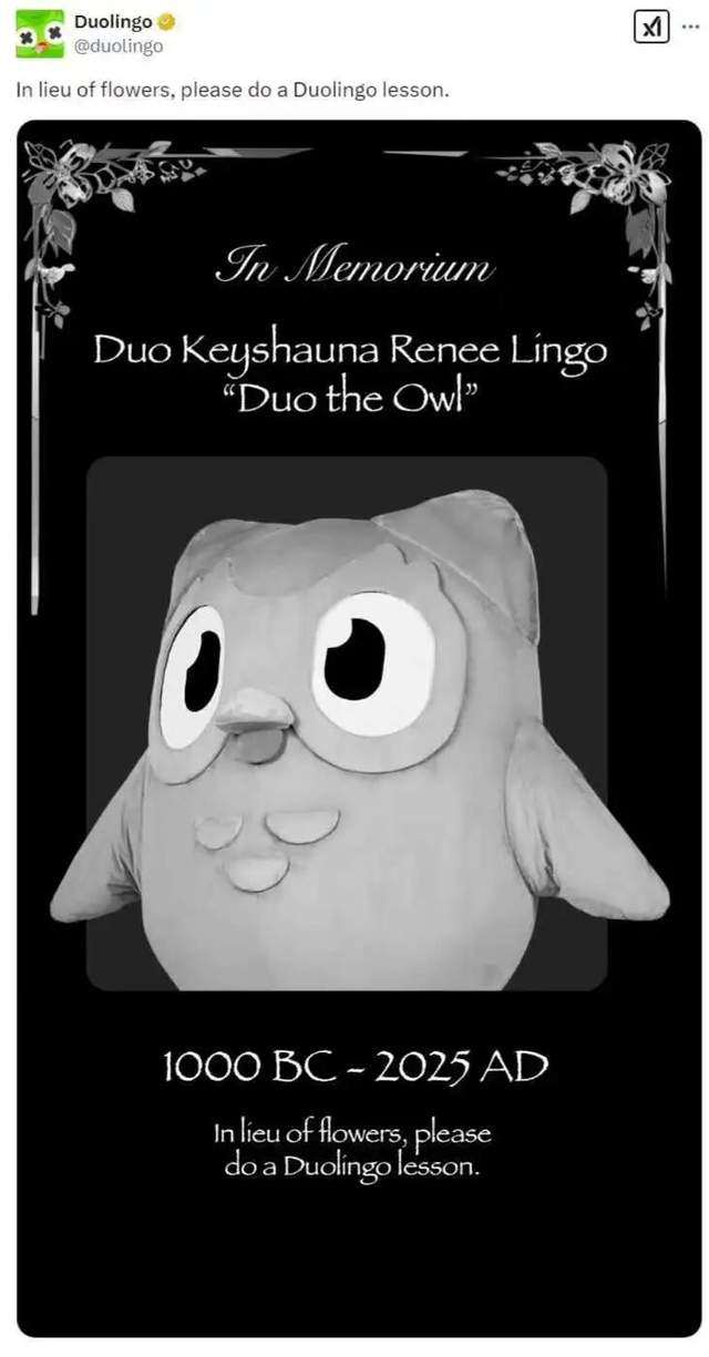 2025年2月,多邻国官推发帖表示多儿死了,紧随其后的是各种各样的游戏官方乃至明星发布联动梗图或者评论。这样的举动把不少休眠用户都“吓”了回来。然后在他们点开软件确认这只鸟是不是真的死了的时候,多邻国就宣布复活,并且说这是它给大家的考验。