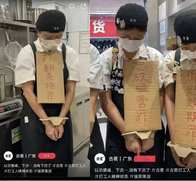 又比如古茗的一家地区分部,曾让员工挂着谢罪牌、戴着手铐杯托,试图制造打工人哭惨诉苦的网感,结果被网友痛批侮辱人格。原因很简单:你没有一个像雪王那样被大众宠爱的人设,发布视频的主视角也是品牌自身,而不是尝试与普通人共情。