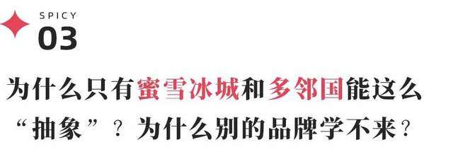 其他品牌绞尽脑汁找热点、找流量,却往往过于小心翼翼显得束手束脚,更有甚者连联动都能不小心成为舆论口诛笔伐的对象的时候,蜜雪冰城却整活玩梗整得无拘无束、玩得不亦乐乎。靠玩抽象做到了行业头把交椅的位置。