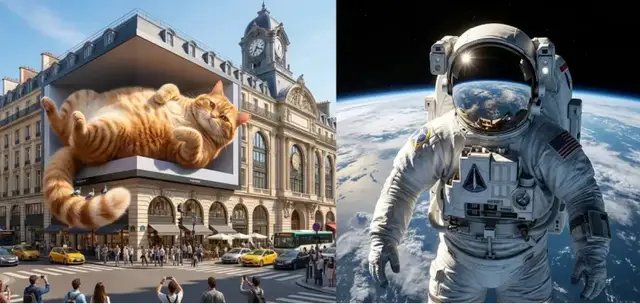 左边是一张十字路口的大型 3D LED 屏画面,里面有一只猫,尾巴是从屏幕里伸出来的;右边是一张很经典的宇航员图片。