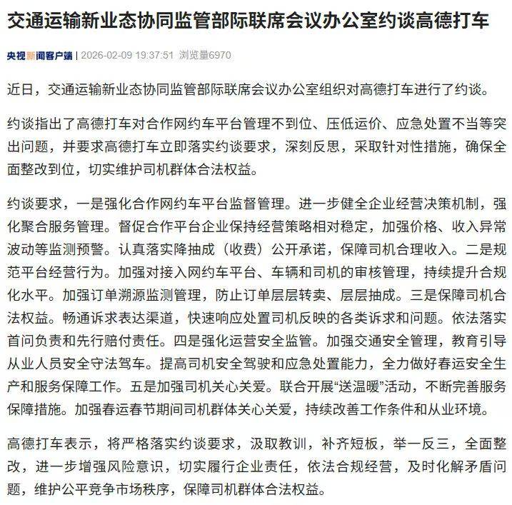 约谈指出了高德打车对合作网约车平台管理不到位、压低运价、应急处置不当等突出问题,并要求高德打车立即落实约谈要求,深刻反思,采取针对性措施,确保全面整改到位,切实维护司机群体合法权益。