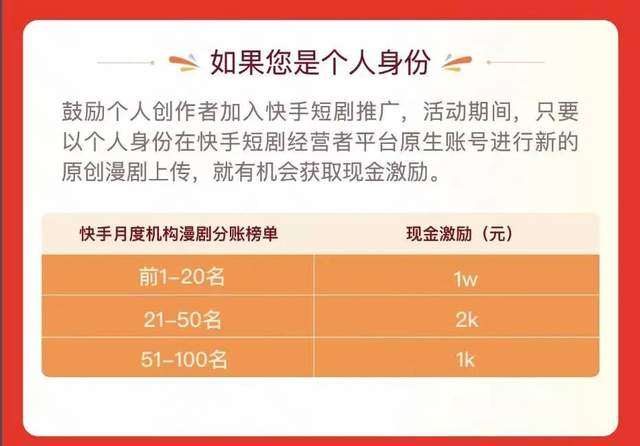2月9日,快手磁力引擎发布最新漫剧政策,特别鼓励个人创作者及小型工作室加入漫剧产业。相关活动期间,以个人创作者身份在快手短剧经营者平台原生账号进行新的原创剧目上传,就有机会获得1000元-10000元不等的现金激励。