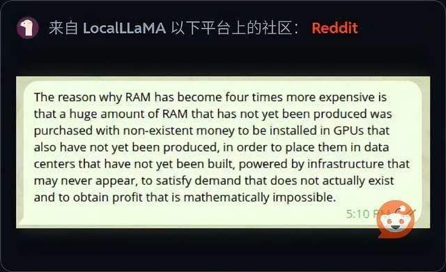 于是,关于内存泡沫的说法,在网上疯狂流传:内存价格之所以涨了四倍,是因为有人用根本不存在的钱,买下了大量尚未生产出来的内存,准备装进同样尚未生产出来的GPU里,再放进尚未建成的数据中心,依赖可能永远不会出现的基础设施供电,以满足实际并不存在的需求,从而获得数学上不可能实现的利润。