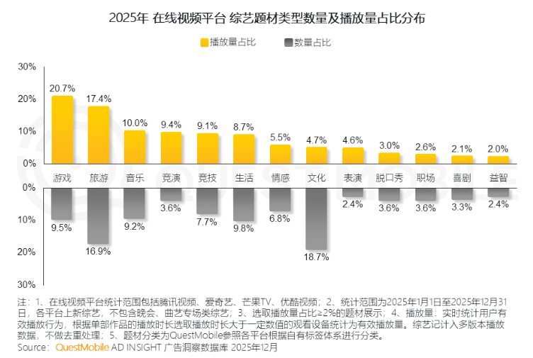 Quest Mobile数据显示,2025年,综艺市场品牌赞助的费用中,有63.7%投向了S、S+级的头部内容。而占比17.4%的旅综,贡献了16.9%的播放量,流量产出效率相对更高。这背后,离不开旅综的天然优势:基于不同的节目定位和主题选择,“旅行+一切”的创作空间弹性更大,过去一年,不少旅行综艺也是借此完成突围。