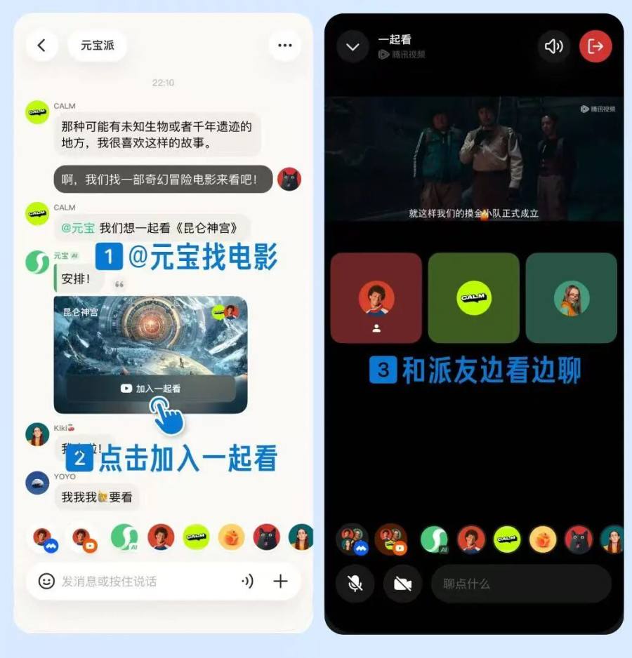 在元宝派,用户可以体验各项全新社交玩法,包括“问元宝”、“共享屏幕”、“一起看电影”、“一起听音乐”等,均将于近期陆续灰度上线。