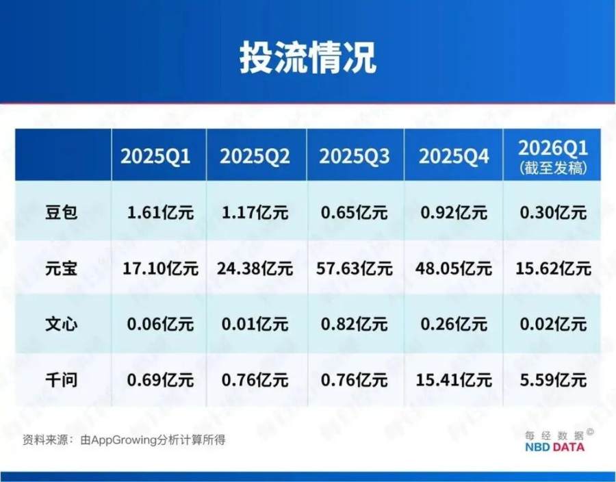 但是,2025年,豆包投流相比竞争对手实现了极大的收敛。根据每日经济新闻和AppGrowing估算,元宝在2025年投流高达150亿元,其中,单第三季度投流就高达57.63亿元,但豆包去年一整年仅投流4.35亿元。