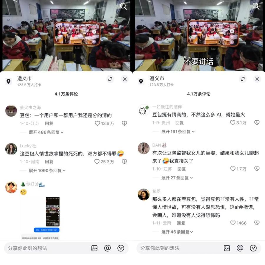 在小红书、抖音等平台,用户不再把它当成写文案、写代码的生产力工具,而是把它用在更具体琐碎的生活里:有人让豆包监督孩子写作业,有人让它帮忙听写单词,甚至也有让豆包监督宠物吃零食……