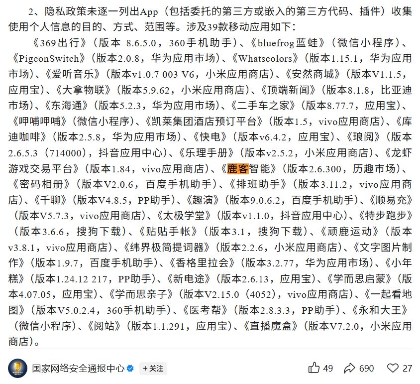 2025年12月,据国家网络安全通报中心消息,69 款移动应用存在违法违规收集使用个人信息情况。其中,鹿客科技因隐私政策未逐一列出 App(包括委托的第三方或嵌入的第三方代码、插件)收集使用个人信息的目的、方式、范围等被点名。