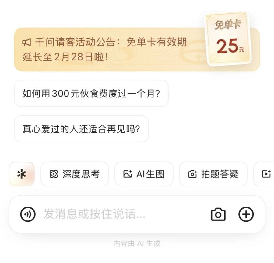 而背靠阿里的千问,早已将注意力放在与阿里旗下业务的联动上,如今这轮真金白银的请客,是在借用免单活动,引导用户体验千问的办事能力。