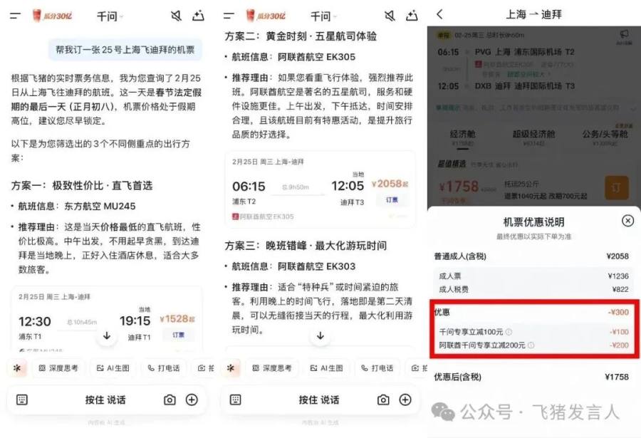 而就在今天,飞猪宣布,用千问App订来自飞猪的机票、酒店、景区门票,可以享受专享价格、权益。微信公众号“飞猪发言人”贴出来的截图显示,用千问购买从上海到迪拜的机票,可以享受千问专项立减100元和阿联酋千问专项立减200元的优惠。