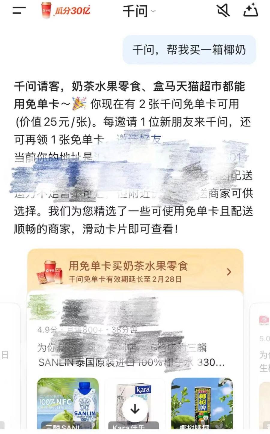 用户量增加后的千问又再添新功能,自2月9日开始,千问APP就出现了免单卡可以买年货的提示。用户不仅能买盒马、天猫超市,还能购买各大连锁商超和便利店的酒水零食、米面粮油、生鲜水果等。