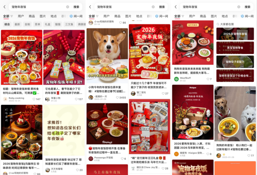 羊肚菌香菇鸡汤、天妇罗炸虾、八方来财蟹糕……这顿年夜饭的食材和摆盘都按“人类年夜饭”的规格来设计,只是调味、油盐比例全部改成适合宠物的标准。她的评论区也很快被“怎么卖”“接不接定制”刷屏,单条帖子询价轻松过百。
