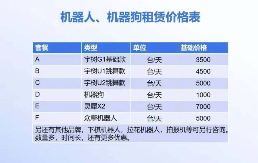举个例子,一款能舞蹈表演、交互对话的智元灵犀X2机器人,一位租赁从业者给出的报价是7000元/天,节假日更贵,大概要花费上万元才能租到。但同型号的产品,在“擎天租”上的价格为5499元/天,租赁30天的话,每天平均仅需2299元。