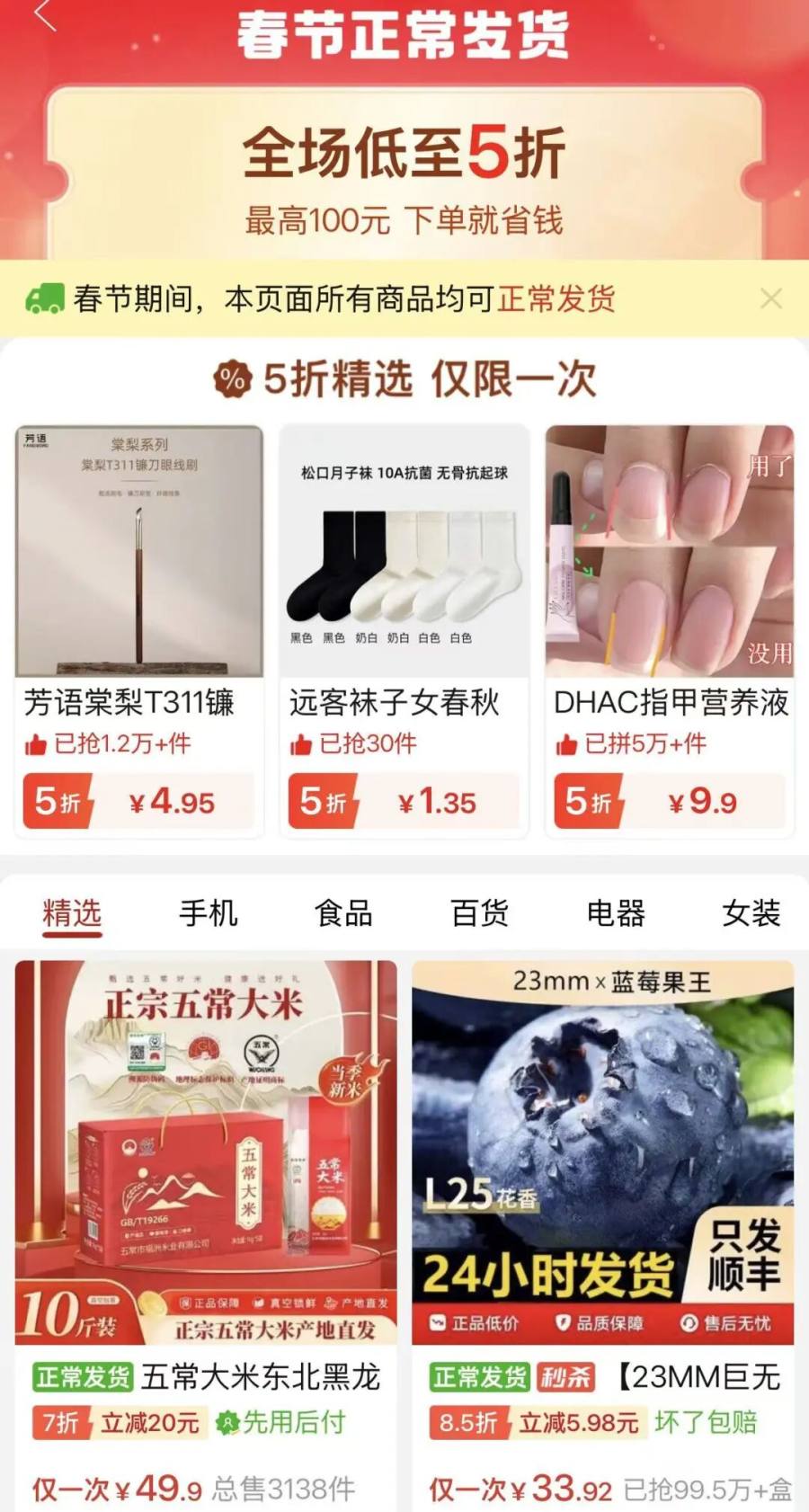 拼多多官方表示,将对所有成功设置“春节不打烊”的商品在搜索端,个性化推荐,APP首页等全站重要位置流量加权;在大促,百亿补贴,限时秒杀,九块九特卖,潮流好价,补贴多人团,省钱月卡等频道进行补贴加权,让用户继续在春节期间享受优惠,助力商家实现生意爆单。