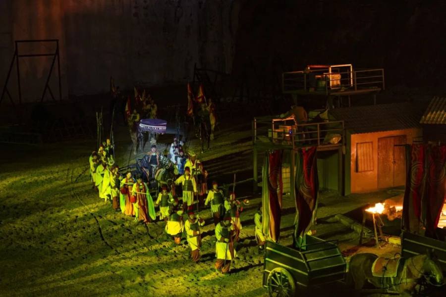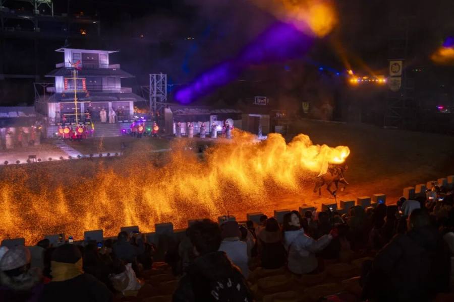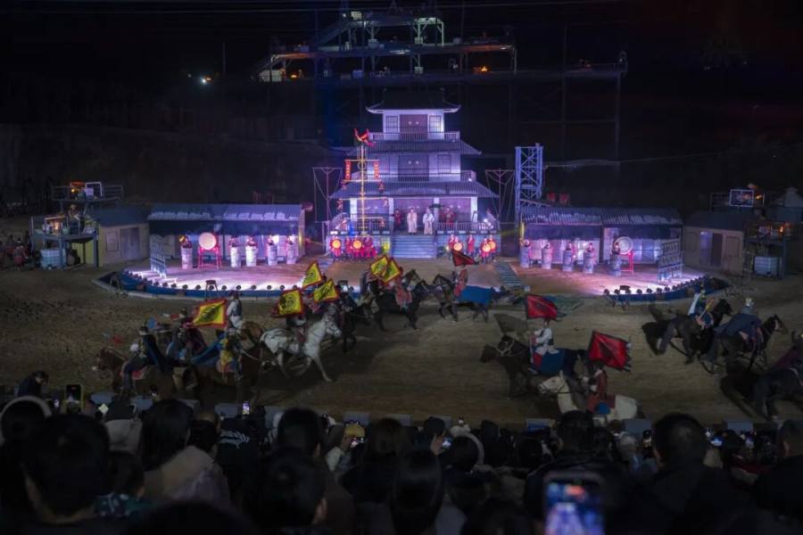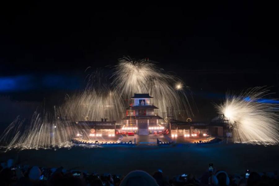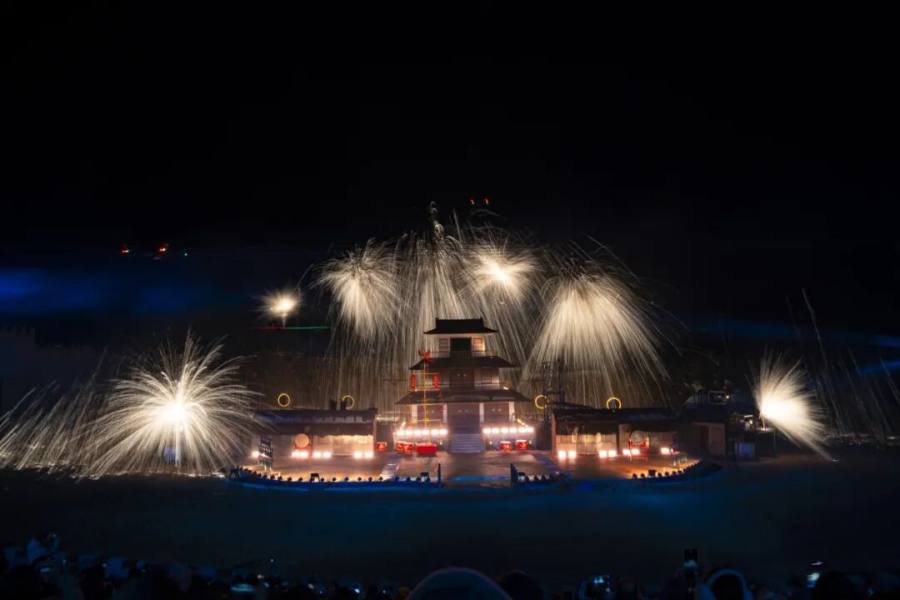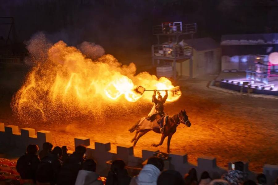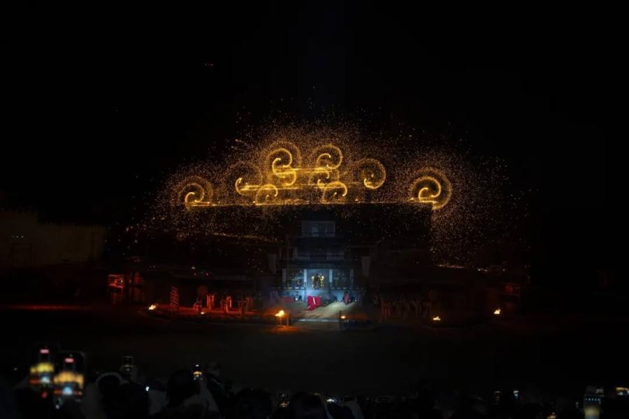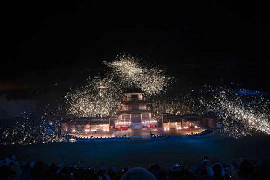 1600℃的铁水被匠人奋力甩出,飞溅的铁花如漫天星雨,璀璨夺目,搭配“牧野之战”实景马术演绎,战马嘶鸣、刀光剑影,再加上现代高科技舞台特效,视听冲击力直接拉满,每一帧都值得珍藏!