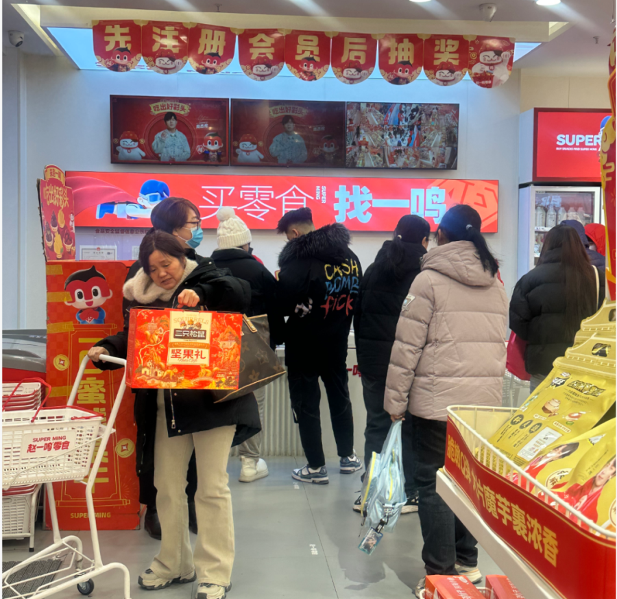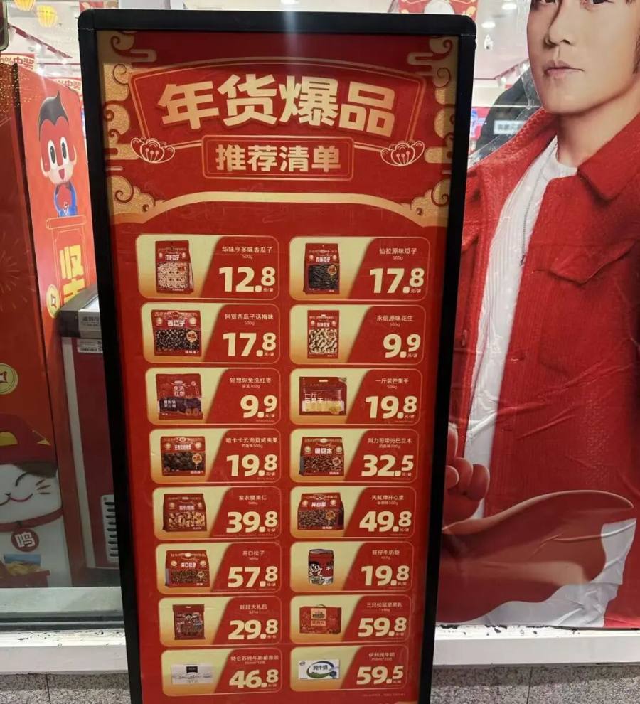天津一家赵一鸣零食店门口,立着块醒目的红色立牌:“年货爆品推荐”——夏威夷果、腰果、芒果干、话梅、瓜子、花生……满满当当挤在一起。