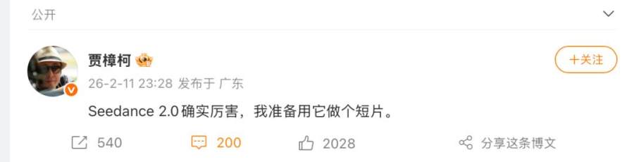 而Seedance 2.0的惊艳表现,甚至让知名导演贾樟柯都不禁感叹:“Seedance 2.0确实厉害,我准备用它做个短片。”