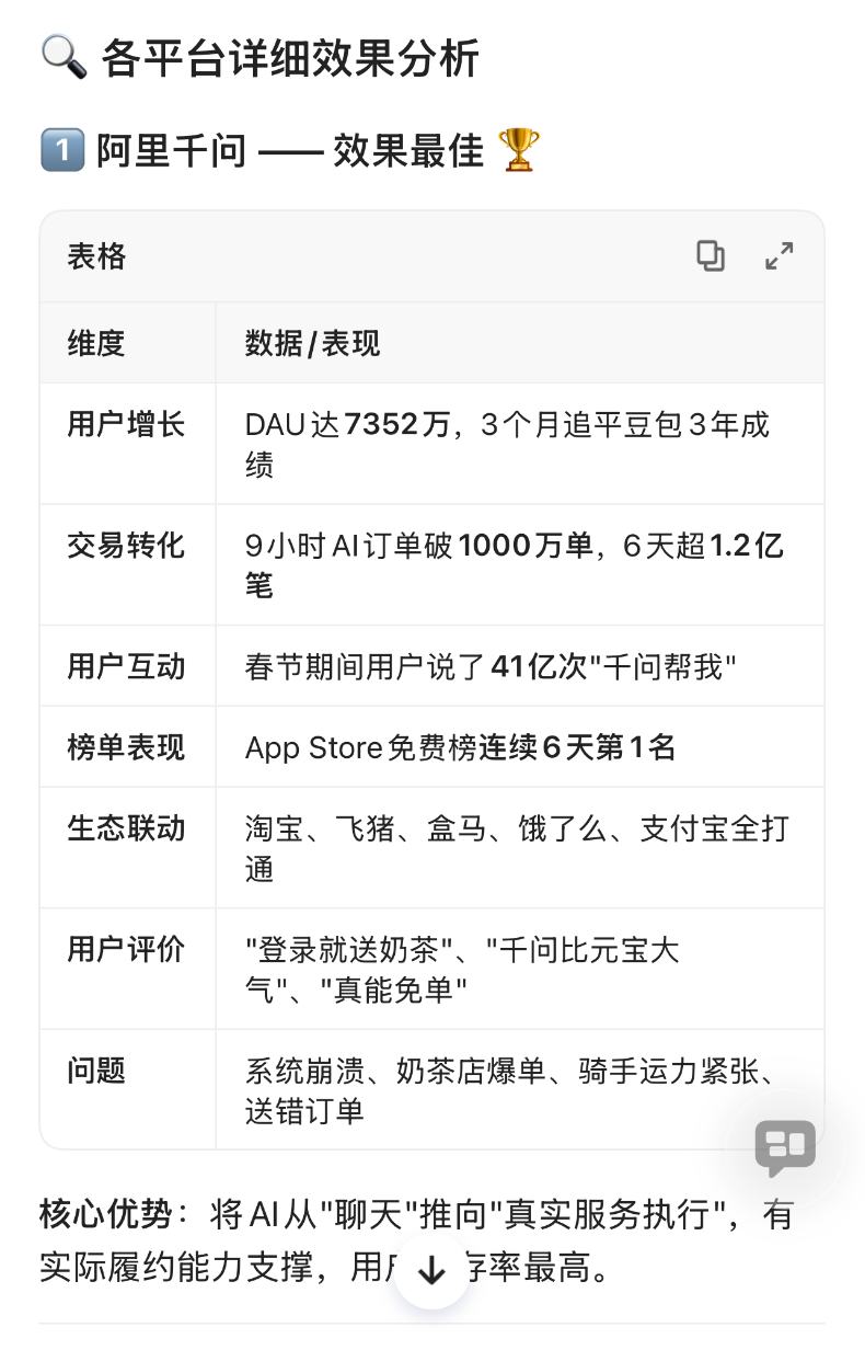 豆包2023年6月开始测试一直领跑AI应用,千问11月17日开始公测,到2月7日不到3个月,DAU追平豆包,这相当于千问3个月走了豆包3年的路。