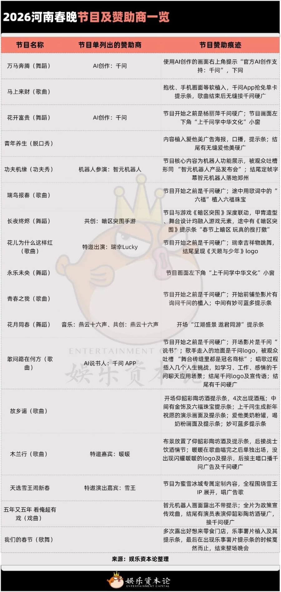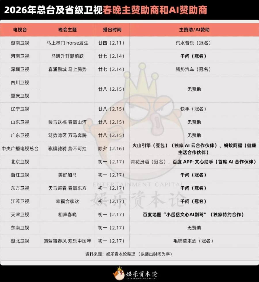 问题还不止河南一家。在全国省台的十几台春晚中,都大量融入了AI元素,以及标榜节目由AI共创,就算是关注度最高的总台春晚也不例外。豆包赞助了总台春晚,百度和千问则分别冠名赞助了2台和4台省级晚会,再加上其他AI厂商,娱乐资本论发现涉及AI广告的一共有十台春晚。