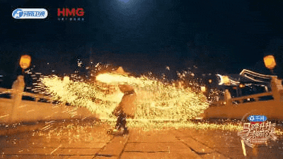 更严重的问题是几个出现打铁花的镜头本来都是真人出演,却因为前后叠加的虚拟烟花和光污染而惨遭喧宾夺主。在传统打铁花舞台上,当表演开始时,它占据了舞台的视觉中心,给观众以震撼,在河南春晚的成片里,它却好像仅仅是个陪衬。真人表演与 AI 特效的界限模糊不清,观众真假难辨,严重削弱了人类主体表演的艺术感染力。