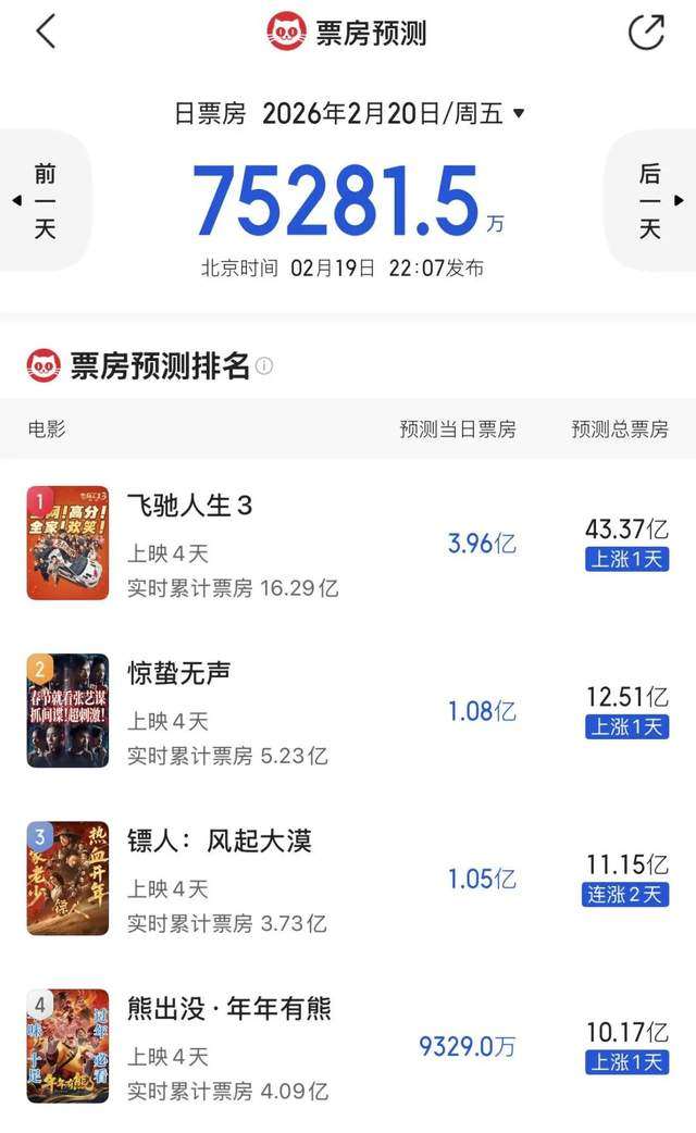 上映3天后,《镖人》凭借武戏口碑回升,一定程度上扭转了票房颓势:昨日其日票房突破1亿,较大年初二的9800万实现逆跌。
