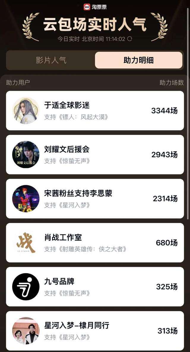 相比之下,真正为《镖人》冲刺预售票房的,反而是排在吴京、谢霆锋之后的于适、陈丽君、李云霄、刘耀文等年轻演员。仅于适粉丝就云包场3315场以上,最终,云包场领票人数达22000+,可见年轻演员粉丝在预售阶段的拉动作用。