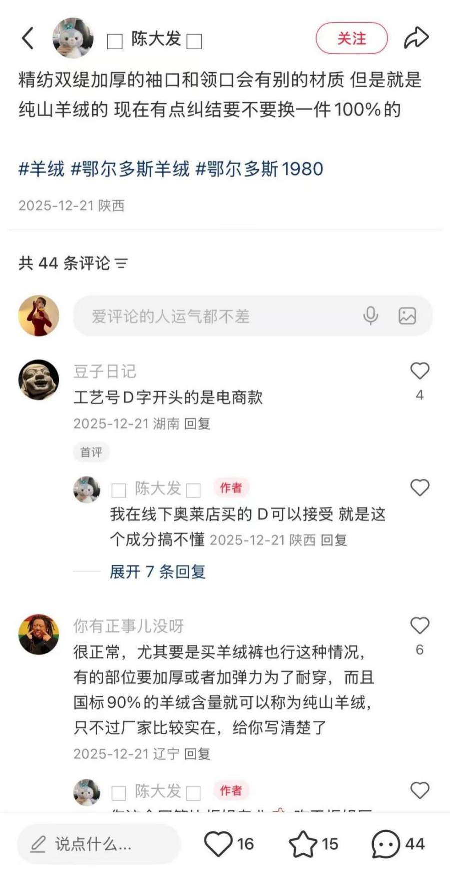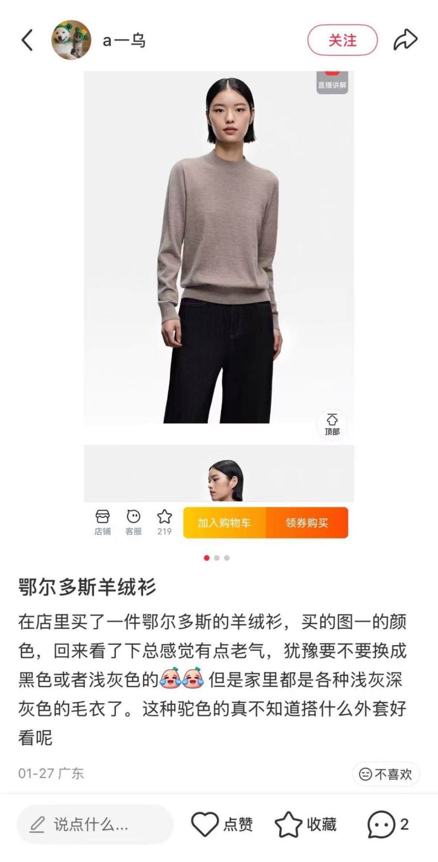 在社交媒体上搜索关键词“羊绒”,羊绒衣物的热度却不如户外、运动、羽绒服等服装品类,且形成了完全相反的两种声音。羊绒的拥趸会为它柔软细密的质感反复购买,但是另一群消费者也会吐槽羊绒“太贵”“款式老旧”“不好打理”。
