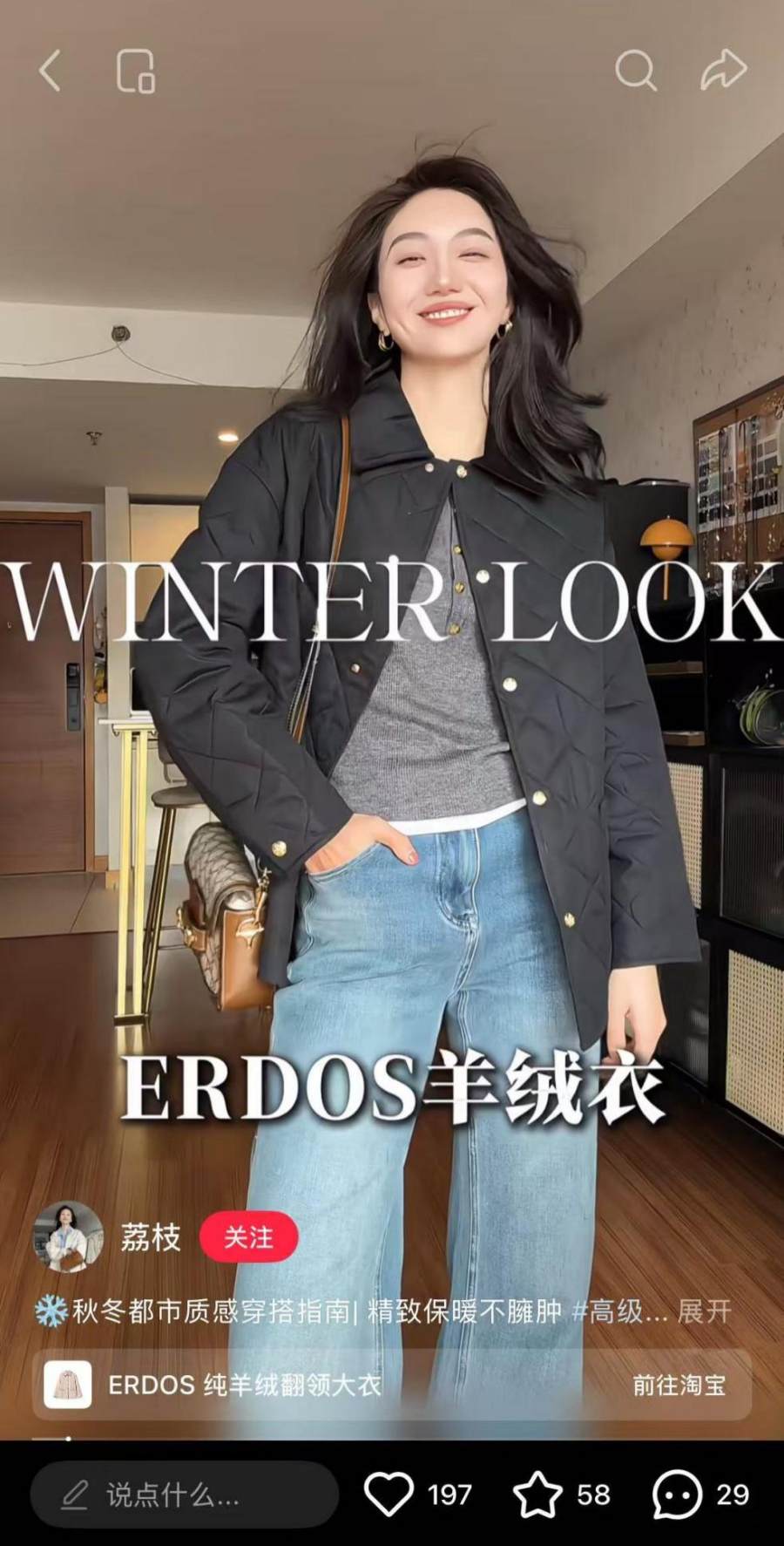 在鄂尔多斯1980 官宣了赵丽颖做代言人后,该品牌似乎也动摇了原本的中年人赛道,尤其是在2000-4000 的重合价格带中,开始尝试用不同款式来制造差异化。“鄂尔多斯的羊绒衫买回来发现还是有点老气”,虽然网上还是有吐槽它款式老气的声音,但是近几年ERDOS已经越来越多地出现在穿搭博主的推荐里。