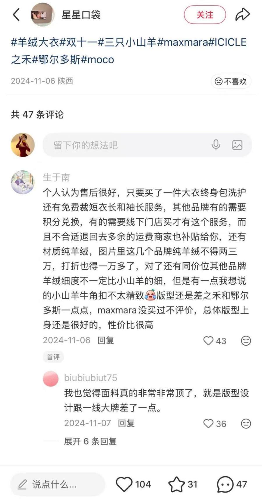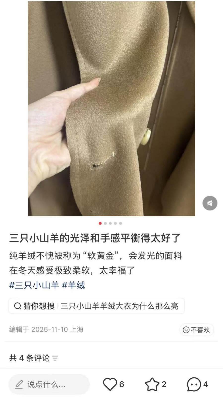 实际上这两种技术并不是三只小山羊的专利。相反,老牌羊绒出于低调含蓄的审美和市场定位,会倾向于保留原料本身自带的油脂光泽,避免烫光带来的“假亮感”,但三只小山羊却需要更有冲击性的感受来吸引消费者,这也反映出它和老钱羊绒的赛道并不相同。此外也有人吐槽它“相较于其他品牌版型一般、设计太老”,而对于一个服装品牌来说,这无疑是增长的隐形天花板。