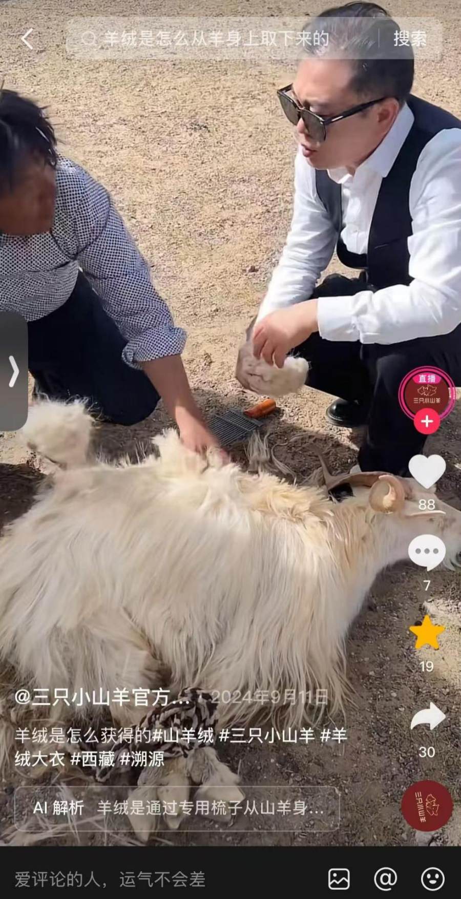 在创始人杨玉勇的故事里:“他的工厂有19年代工背景,而他为了打破奢侈品的价格垄断,宁愿卖房也要自建品牌” 这个颇有民族企业家风格的故事为创始人在抖音积累了原始粉丝。在短视频里,他会讲解羊绒鉴定技巧、溯源三只小山羊的原料和工艺,追忆给大牌代工的往事,用14.5微米的数据和一生只有一次来凸显羊绒原料的珍贵。