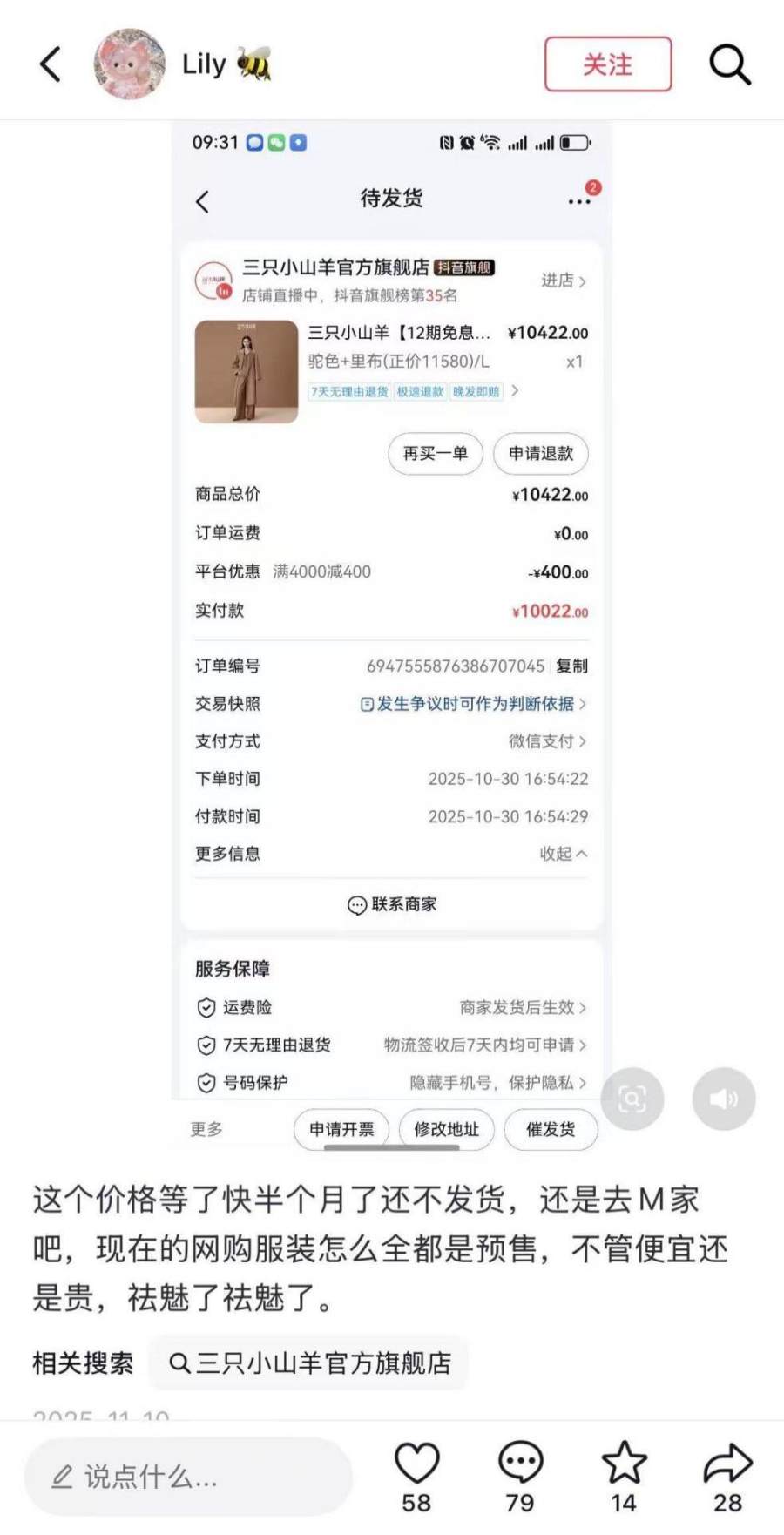 “ 买个衣服还买成期货了”,尽管三只小山羊承诺提供终生养护和不降价,却仍然存在发货问题,因为传统的羊绒大衣生产链需要足够的时间确认生产细节,而电商则要求工厂可以快速反应做到小单快反,同时也不免会生出“是否把退货发给第二批客户”的质疑。