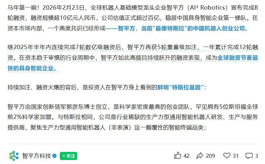 前一天,2月23日,全球机器人基础模型龙头企业智平方宣布完成B轮融资,规模超过10亿元。智平方表示,该轮融资之后,公司估值超过百亿,并稳居国内具身智能企业第一梯队。本轮投资资本端涵盖互联网和AI巨头、头部央企、特斯拉生态链龙头等多方力量,投资方包括百度、中国中车、宇信科技、森麒麟、沄柏资本、国泰海通等。