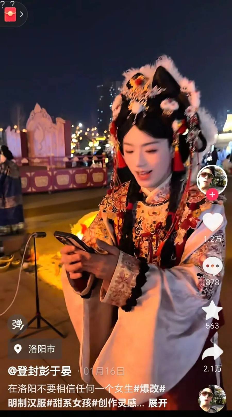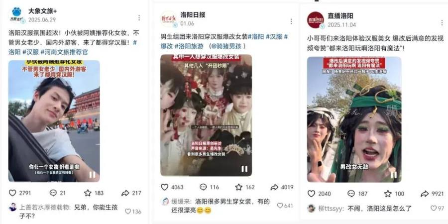 同时,在宣传端,从去年十一到今年春节,洛阳文旅不仅没有回避这种看似“离谱”的男扮女装现象,反而巧妙地将其融入宣传中,使其成为又一个引爆社交媒体的热梗。河南文旅官抖、洛阳广播电视台官抖、洛阳日报官抖等多个官方账号下场选择网友素材进行正向报道,强化汉服经济,也带动了更多正向氛围评论,展现了包容的城市态度。