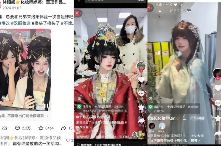 这也让不少汉服店看到了差异化竞争的商机。老城区的“十月初汉服坊”官抖打出了“男生来洛阳必做的大祭司妆造”话题,收获数万点赞,同时,其店内多个化妆师也批量发布男生爆改女装内容作为核心引流点,尤其是账号“洛阳化妆师Qin”,专门拍摄男生女装内容的视频,多条收获10万+点赞。