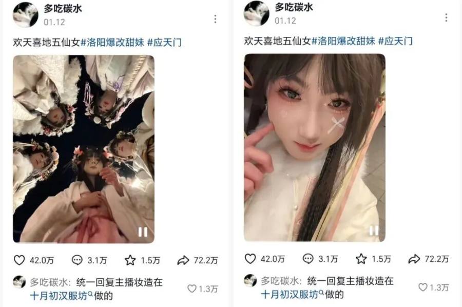 今年春节,更有不少“一人开团,兄弟秒跟”的“五仙女”“七仙女”版男生在洛阳群体变装的视频收获了泼天流量,进一步引发跟风热潮。