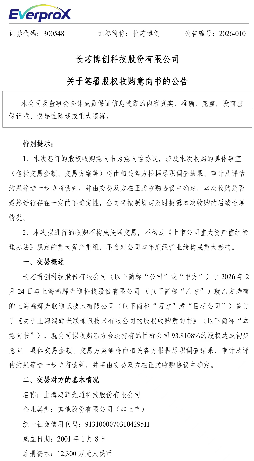 2026年2月24日,长芯博创(300548.SZ)发布重大资产收购意向公告,公司与上海鸿辉光通科技股份有限公司签署股权收购意向书,拟以3.75亿元的暂定价格,收购其持有的上海鸿辉光联通讯技术有限公司93.81%股权。