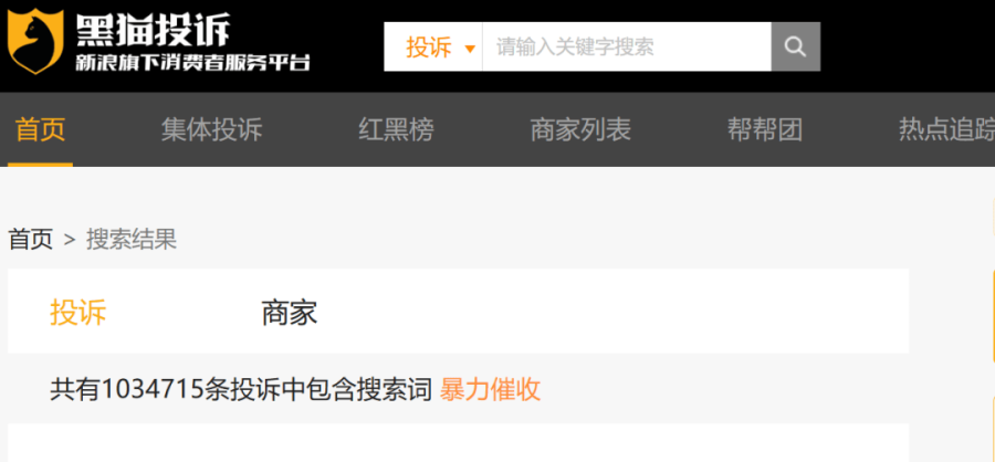 查询黑猫投诉,截至目前,以“暴力催收”作为关键词的搜索结果超过100万条。