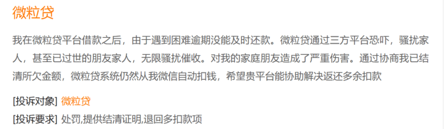 与微粒贷有关的6万多条投诉中,暴力催收更是“高发区”,被斥非法窃取资料,滋扰在职公司、亲朋好友等,甚至已过世的朋友家人;以及在协商分期还款成功的前提下,仍给家里老人打电话、发短信威胁……
