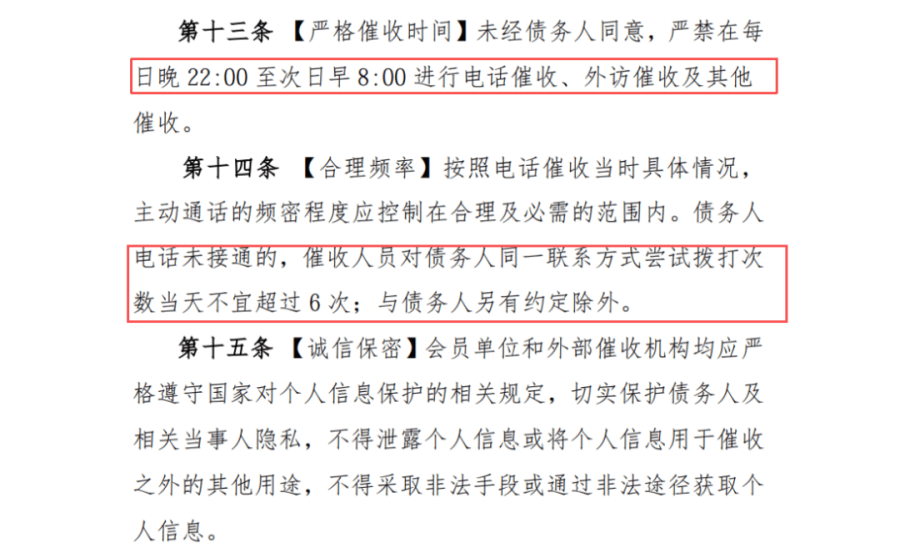 未经债务人同意,不得在每日晚22:00 至次日早8:00进行各类催收;电话催收时,对债务人同一联系方式当日尝试拨打次数不宜超过6次,避免过度骚扰。
